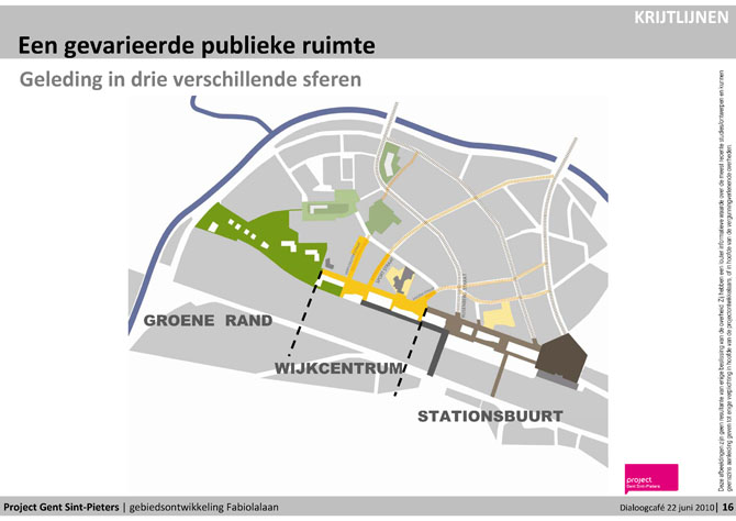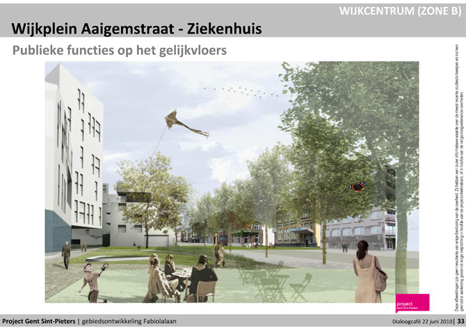 De hieronderstaande tekst en simulatiebeelden vormen een ontwerp van synthese op datum van 22 juni 2010, datum waarop de betrokken grondeigenaars een dialoog en raadpleging organiseren met de buurtbewoners en stakeholders. De synthese heeft op dat moment GEEN statuut van een politiek goedgekeurd document. De publieksvergadering, en de raadpleging via formulieren (o.m. op www.projectgentsintpieters.be) heeft juist tot doel om ook de signalen en bezorgdheden van bewoners, handelaars en betrokken organisaties mee te integreren in een document dat een belangrijke studieperiode afsluit.
